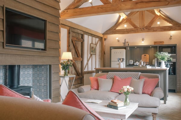 Our one-bedroom Piggery is a large romantic one-bedroom barn perfect for a couple looking to escape from the rigours of modern life. It has characterful timber framing, with full kitchen, open-plan living room with woodburner and a fantastic large bathroom with shower and sculptural bath. It also enjoys a splendid large private sunny and sheltered courtyard twice the size as the barn itself.